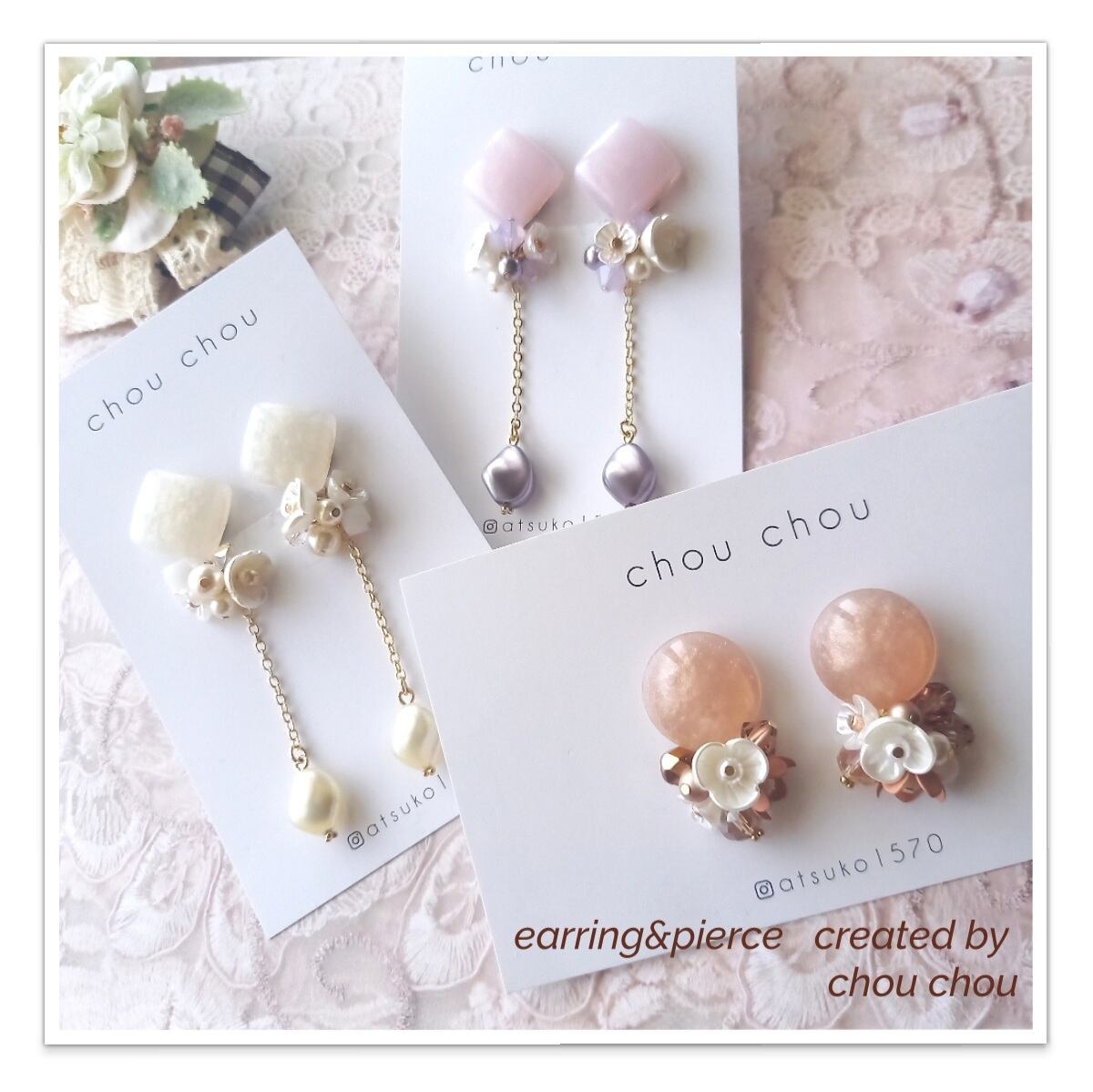イヤリング chou chou レジンスクエアカボション チェーンゆらゆらイヤリング ホワイト / パープル