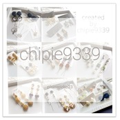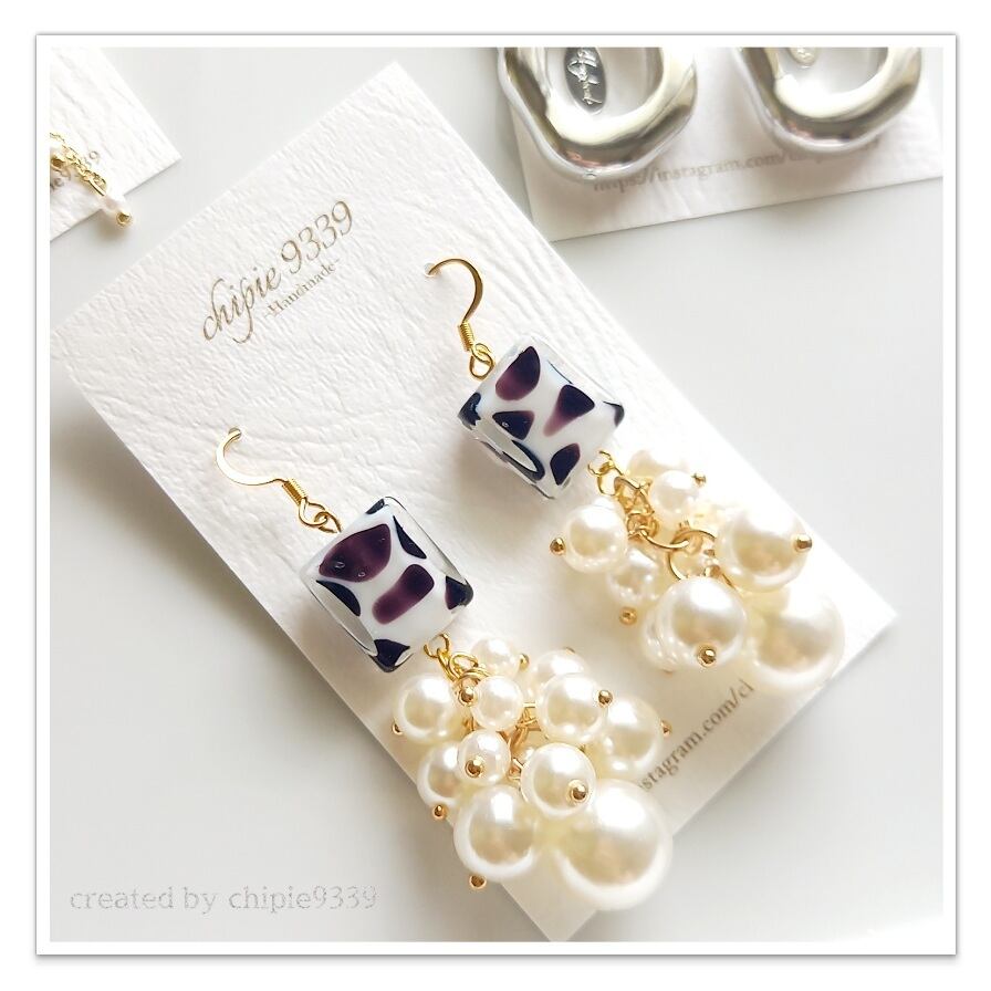 ピアス:chipie9339 No.14.15.19 アバロン風カボション✕シルバー / ダルメシアン✕パール / ベージュアンティーク調カボション✕ゴールドフラワー✕パール ピアス(ステンレス)