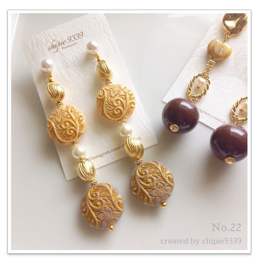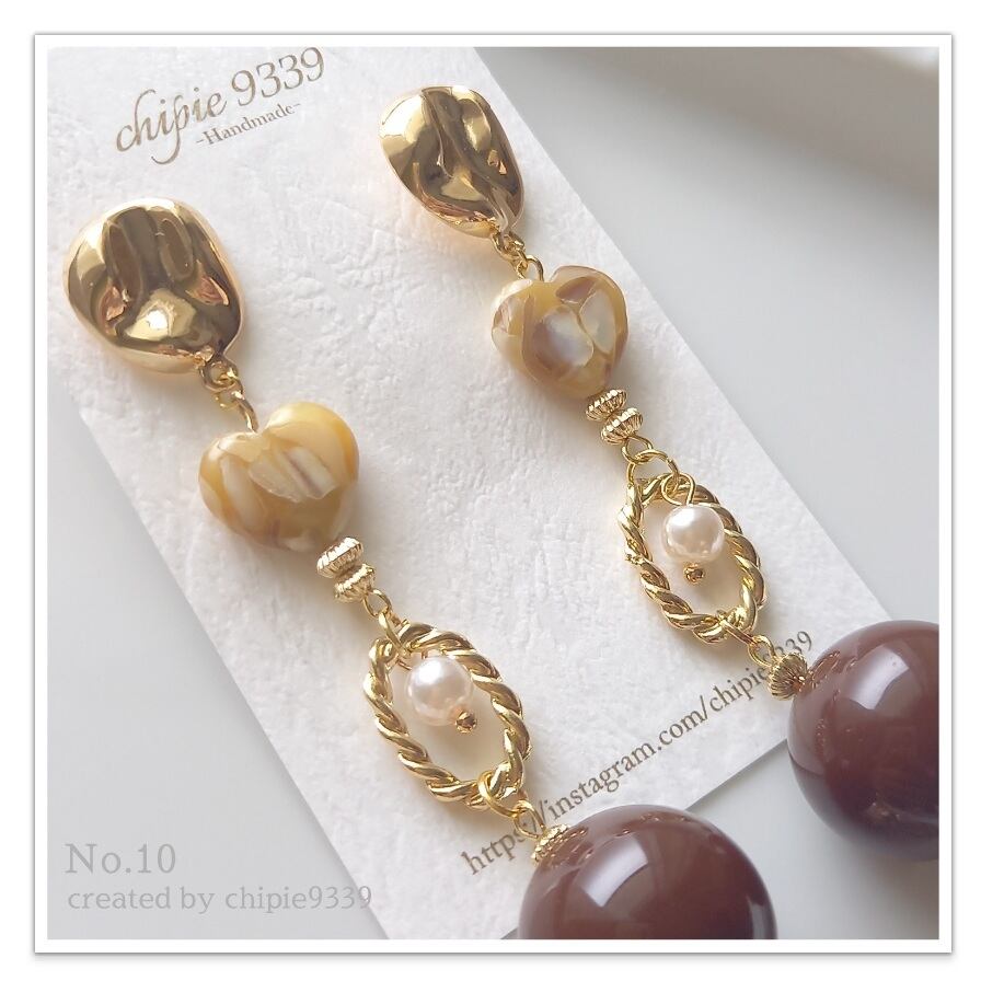 ピアス:chipie9339 No.10.22 ハートシェル✕ゴールド / 2カラーアンティークカボション ピアス(ステンレス)