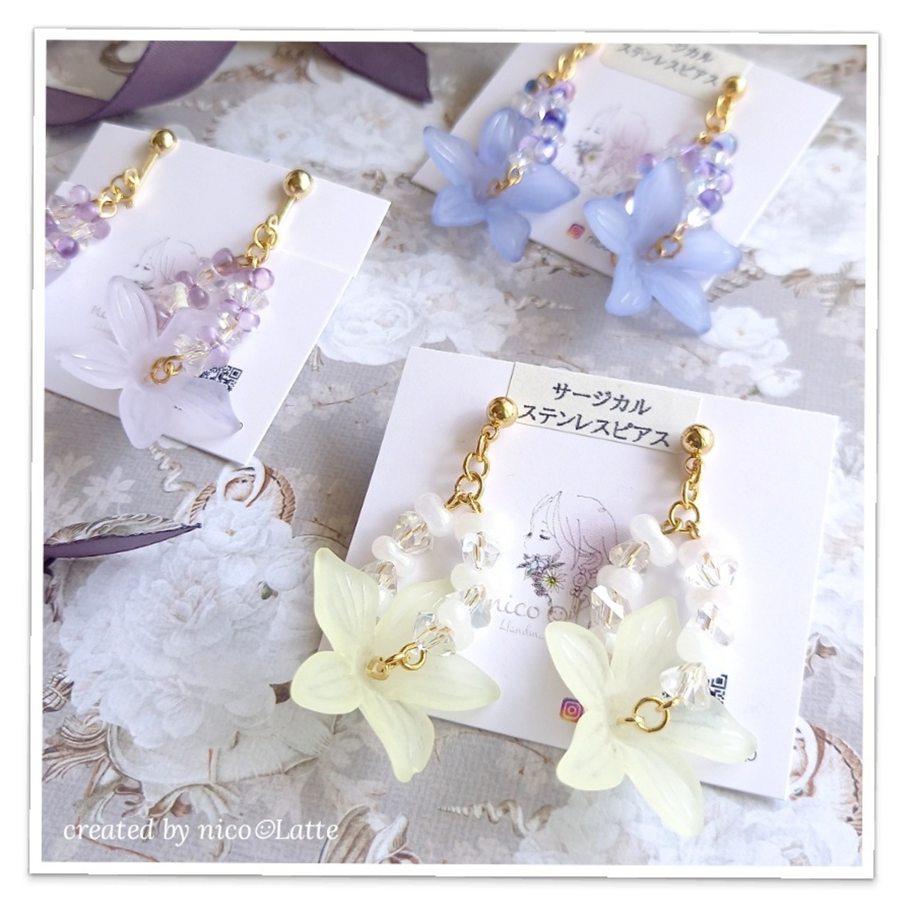 イヤアクセサリー nico☺︎Latte : No.77~79 きれいめフロストフラワー✕ガラスビーズ ピアス・イヤリング